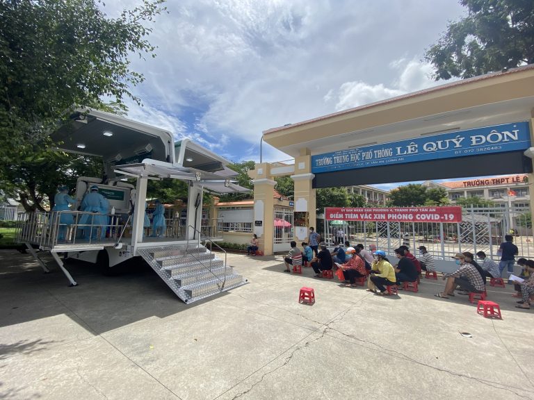 Sau khi tiếp nhận xe, chiều ngày 12/8, Trung tâm Kiểm soát bệnh tật tỉnh Long An tổ chức tiêm vắc-xin phòng Covid-19 bằng xe lưu động tại điểm tiêm trường THPT Lê Quý Đôn, phường 4, thành phố Tân An.